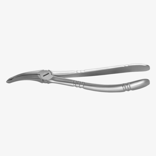 Wurzelzange für den Unterkiefer. Der gewichtsoptimierte Griff bietet maximalen Komfort und optimales Handling bei gleichzeitig einfacher Reinigung der glatten Oberfläche. Das matte Finishing des Griffs reduziert störende Reflexionen. Die Teflonscheibe im Verschluss sorgt für eine fast wartungsfreie Lebensdauer und eine exzellente Leichtgängigkeit.