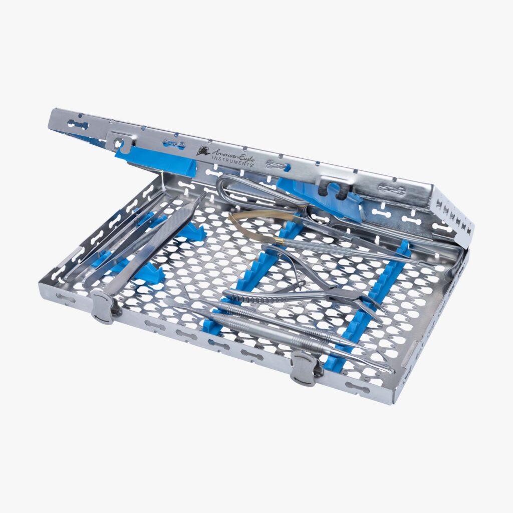 Chirurgie-Kassette für bis zu 17 Instrumente, DIN inkl. 2 Druckschienen V-Profil, 4 Trägerschienen, 5 Farbkodieroptionen (lila, rot, gelb, grün, schwarz), 285 x 183 x 37 mm